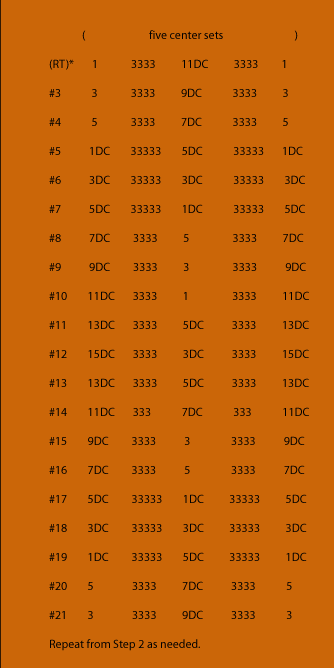 Repeat from Step 2 as needed. This pattern is best done on a rectangular frame. Should you do it on a shaped frame needing filler warps, be aware that there is a centered 5,3,1 forming vertically when you wove horizontally. Helen B. Cribbs |