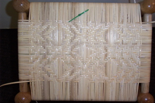 Due to variable number of warps in each project, only the 5 CENTER SETS of instruction are given. Outward, both left & right, weave the diagonal herringbone in 3's. Now, at the very center point of the seat, weave ONE CENTERED ROW as follows: At 6 left, 6 right & the 1 CENTER MARKED STRAND, weave under these 13 DC warps. Outward to each side; 3 over, 3 under, 3 over, 5 under then continue in normal "3" herringbone through the end of the row. This means, weave the warps from the 13 under to the right, finishing the row, pulling your weaving strand on out enough to weave back through the left half. You now have your starting point row complete. Work the entire underside in regular "3" herringbone. Having a long flat skewer to pre-pick the under-over is helpful. * RT-- Reverse of herringbone pattern begins ** DC Diamond counts are all woven UNDER NOTE: Center diamonds are 13 strands (warps) wide. Outer diamonds are 15 strands (warps) wide. |