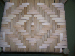 | Warp frame front to back, until back rail is filled. Clamp start stop strand ends to their rail & weave into pattern when you can. Find center strand and mark with a twisty tie. Find center point of each side rail and mark with an ink marker. Now, at the very center( ink mark) point of the seat weave ONE CENTERED ROW as follows: Weave under: 4 LEFT, 4 RIGHT and (1) CENTER STRAND, a total of 9 under draws. Outward to each side; 3 over, 3 under as in normal herringbone weave. This involves weaving warps from the 9 under to the right, finishing the row, pulling your weaving strand out enough to weaving back through the left half. But you now have your starting point row complete. Having a long flat skewer to pre-pick the under, over is helpful too. Pull the end of the strand to the underside enough to weave one row in herringbone. Weave a second row on the underside, south,with the long end of this first strand. The following instructions are for the CENTER DIAMOND only. Remainder of each row will be the normal Herringbone weave. 1st row south: 3 under. 1 over marked center strand, 3 under. 2nd row south: 3 over, 5 under at marked center strand, 3 over. 3rd row south: 3 over, 3 under at center marked strand, 3 over. 4th row south: 3 over, 1 under at center marked strand, 3 over 5th row south: 3 under, 5 over at center marked strand,3 under. 6th row south: 3 under, 3 over center marked strand, 3 under. Now, weave these 6 rows of pattern on the north side of the ONE CENTERED ROW. FILLERS, on front rail, left and right( if necessary). Match herringbone pattern as you weave in each piece, BUT, BE AWARE, that there is a center 5, 3, 1 forming vertically as you just wove horizontally. Follow in pattern each draw. Repeat weaving rows 1-6 north and south to finish out your project. I find this pattern rather easy to weaver once the first 6 rows north and south are in place because each draw is done in herringbone until the center where the change is 5, 3, or 1. AND---when you are really confident, you will have several fillers and new strands all happening at the same time on top before turning the project to the under side. Helen B. Cribbs |